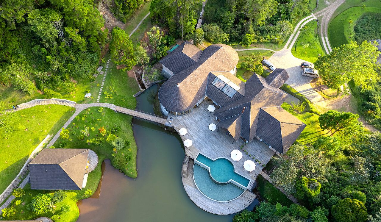 The main building is set at one end of the lake with a large decking and pool area.
